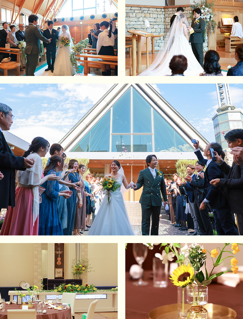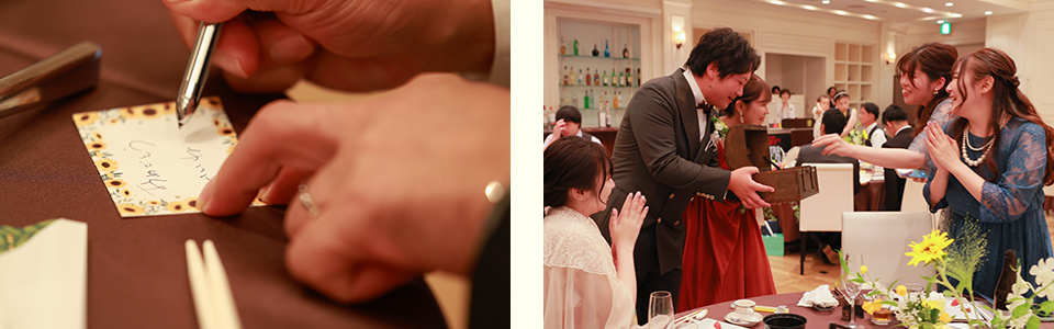 退場前、おふたりに手渡された空っぽの宝箱は、ゲストからの祝福の言葉たちでいっぱいになりました。祝福に満ちた一日はひまわりのように明るい輝きで溢れました。この日の思い出も、これからの人生を温かく照らし続けていくことでしょう。