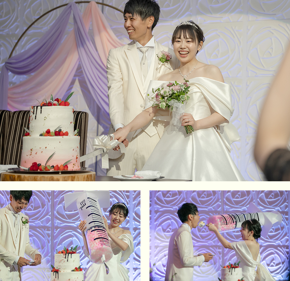 高校時代、リレーに情熱を注いでいたこころさん。あの頃の想いを重ねるように、ウェディングケーキはゲストからおふたりへとバトンのように受け渡されました。たくさんの“想い”がつながる、幸せのリレーです。