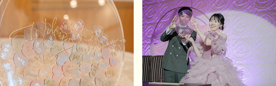 クリアのハートドロップがきらめく、可愛らしい結婚証明書が完成!おふたりの想いを形にした、愛らしいワンシーンです。