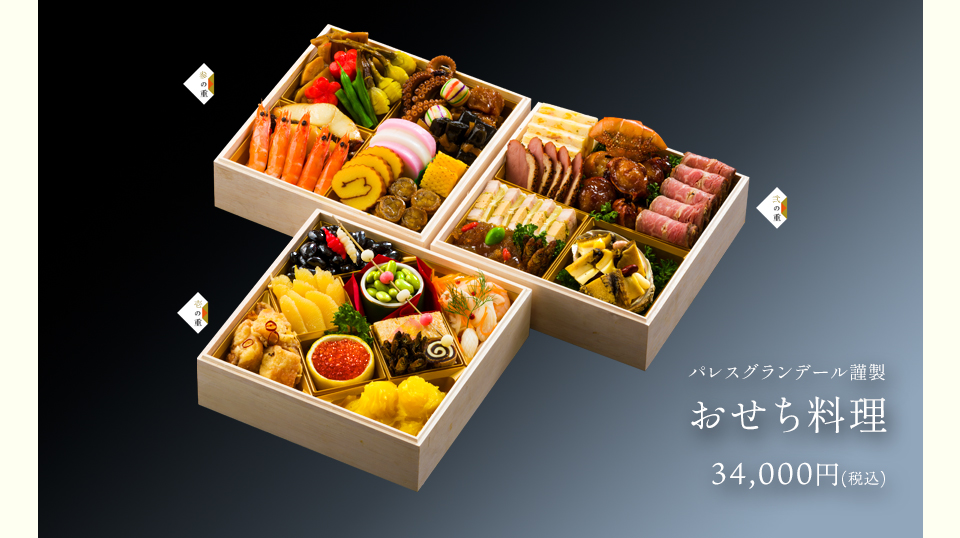 一品ごとに先人の想いと真心を込めた、豪華な三段重。日本古来の和の心と食の真髄をパレスグランデールからお届けします。