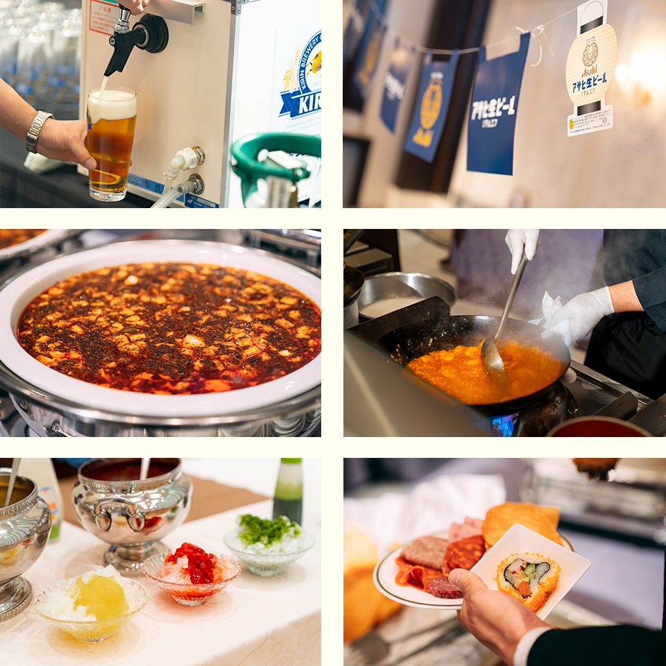 和・洋・中3厨房のシェフとパティシエからは、世界各国の本格料理をビュッフェスタイルでご提供。生ビール・ワイン・カクテルなど、豊富なドリンクと一緒に世界のグルメをお楽しみください。一部有料スペシャルドリンクも!